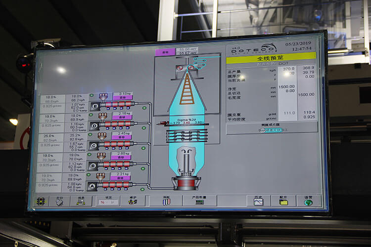 先進(jìn)的自動(dòng)化模塊:五層共擠吹膜機(jī)生產(chǎn)線具有先進(jìn)的自動(dòng)化功能,集中供料、配料、克重控制IBC內(nèi)冷、自動(dòng)厚度控制和全自動(dòng)中心收卷等。全部集成于觸摸屏集成控制。使操作更為簡便,成產(chǎn)效率提升。
